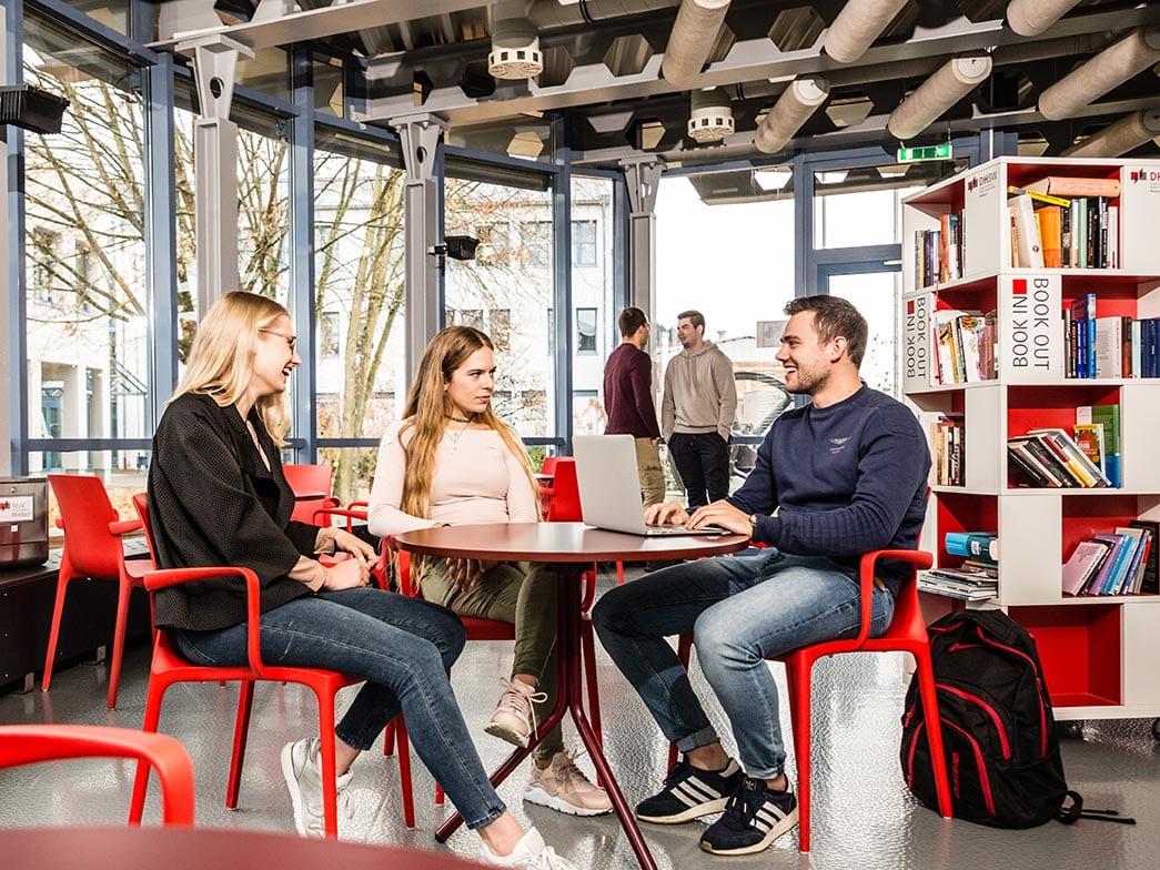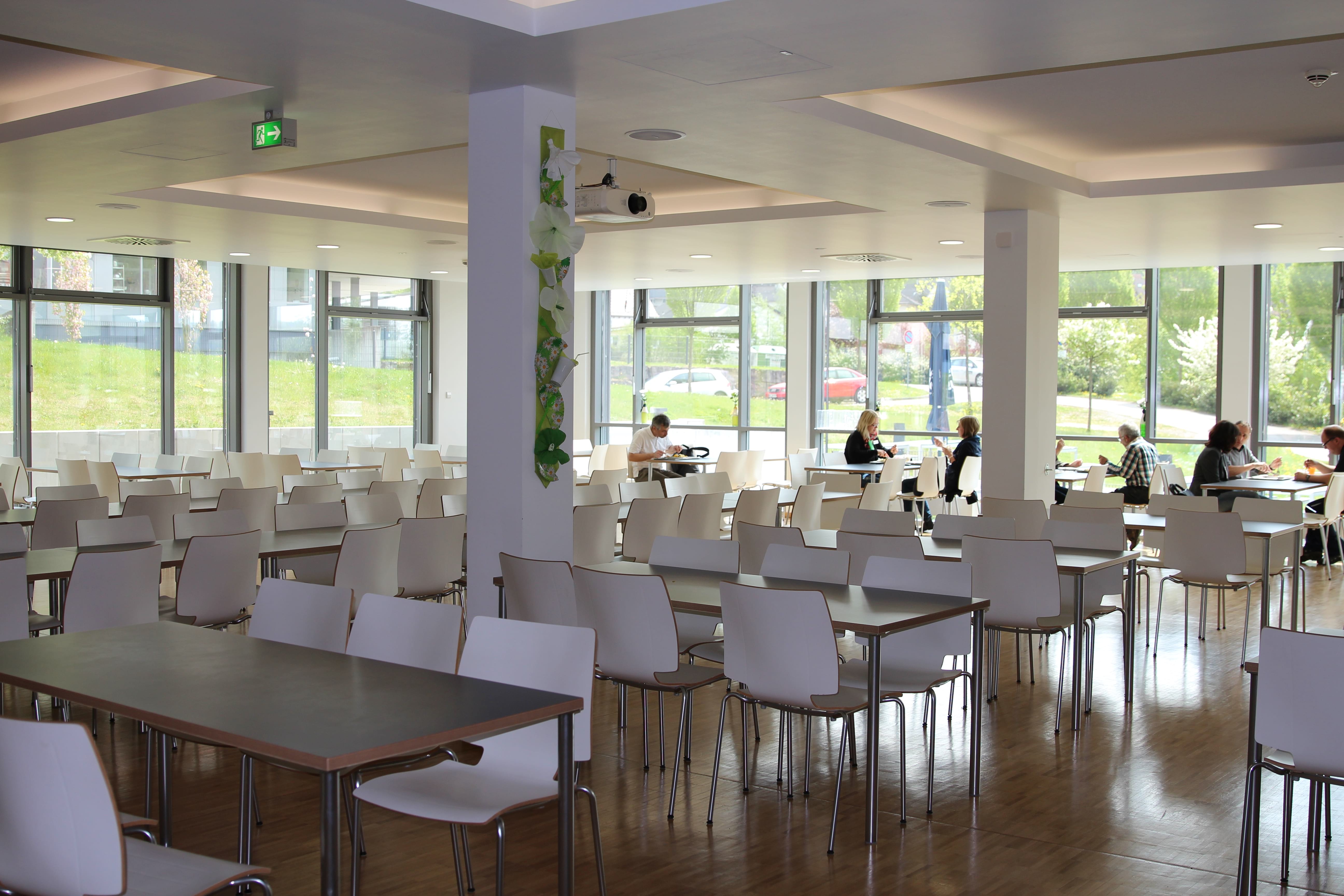 Einen Snack oder schnell einen Kaffee bekommst du in der Cafeteria im A-Gebäude. Dort kannst du zwischen den Vorlesungen und Seminare entspannen und bei Bedarf sogar spontan ein Buch lesen.