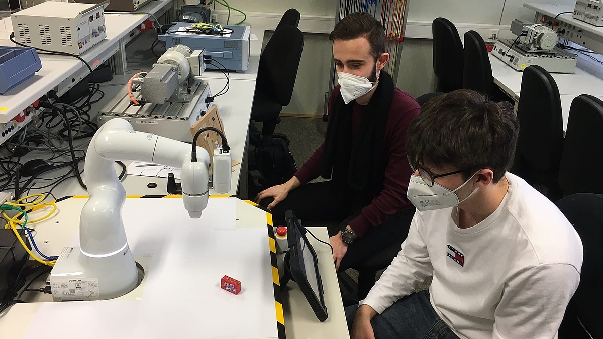 Für den Einsatz in Laborübungen und für Studienarbeiten stehen vier Cobots zur Verfügung. Im Schwerpunkt Produktion und Logistik im Studiengang Wirtschaftsingenieurwesen haben die Studierenden eine neu konzipierte Laborübung absolviert, in der sie die kinematischen Möglichkeiten der Roboter und einige grundlegenden Funktionen wie Teaching mittels handgeführtem Modus, Teilehandling, kameraunterstützte Objekterkennung und Verfahrstrategien kennengelernt und angewendet haben.
