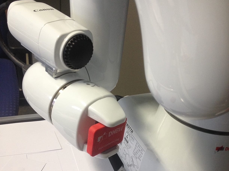 An der DHBW Mosbach kommen Cobots vom Typ Cobotta des Herstellers Denso zum Einsatz. Mit einem Eigengewicht von ca. 4 Kilo, einer Traglast von 0,5 Kilo und einer eingebauten Kamera werden sie in der Industrie z.B. für die Automatisierung einer Teilezuführung oder Maschinenbestückung direkt an den Maschinen eingesetzt. In unserer Fertigung steht der Cobot am Ende der Fertigungslinie. Mit Hilfe eines eingebauten 2-Backen-Parallelgreifers ist er darauf trainiert, das Produkt vom Transportwagen zu entnehmen und entweder zu lagern oder direkt dem Kunden zu übergeben.