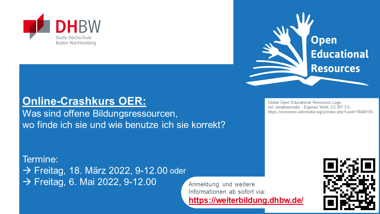 Die Veranstaltung "Online-Crashkurs OER: Was sind offene Bildungsressourcen, wo finde ich sie und wie benutze ich sie korrekt?" findet jeweils am