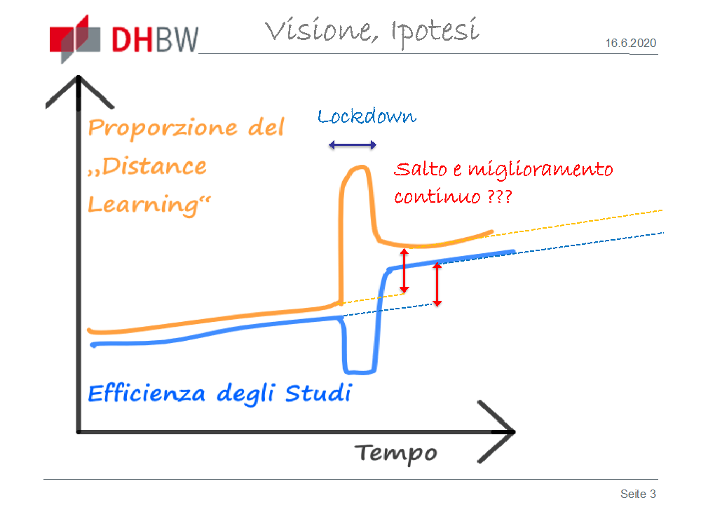 Die Fachbeiträge eröffnete Professor Dirk Saller (DHBW Mosbach) mit einem kurzen Überblick über das aus zwei Phasen zusammengesetzte Gesamtprojekt „CLUE“ (Corona Lockdown University Experience). Er betonte, dass die vorgestellten Ergebnisse als Zwischenergebnis der ersten Phase zu verstehen seien, in der die Situation zu Beginn des Corona-Semesters untersucht wurde. Er schloss seinen Vortrag anhand eines Graphen, der als hypothetischer Blick in die Zukunft verstanden werden und – bei geeigneten Erkenntnissen und Maßnahmen nach dem Corona-Lockdown – einen nachhaltigen Effizienzsprung in der Hochschullehre widerspiegeln solle.