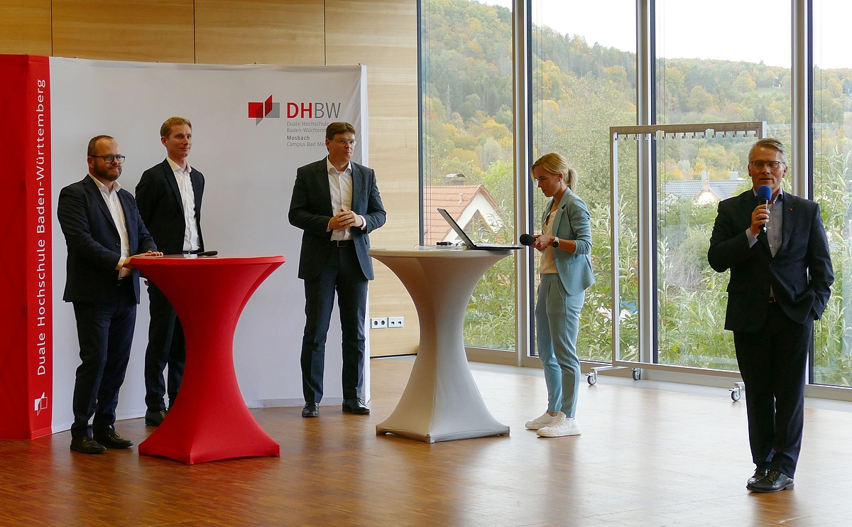 Zur Begrüßung und Einleitung führte Professor Emmert in das Thema ein, das bereits bei seiner Premiere 2020 auf ein großes, überregionales Interesse gestoßen war. „Ich denke, uns allen ist klar, dass wir hier vor riesigen neue Möglichkeiten stehen und nur zu oft nicht wissen, wie wir uns diese Möglichkeiten zunutze machen“, warb er für die Studienrichtung. Weil man das Zunutzemachen vor allem von Unternehmen lernen könne, die Erfahrungen hätten, freute sich Emmert, drei ihrer Vertreter in Mosbach zu begrüßen und darauf hinzuweisen, dass alle drei Unternehmen Duale Partner von BWL-Digital Business Managments seien.