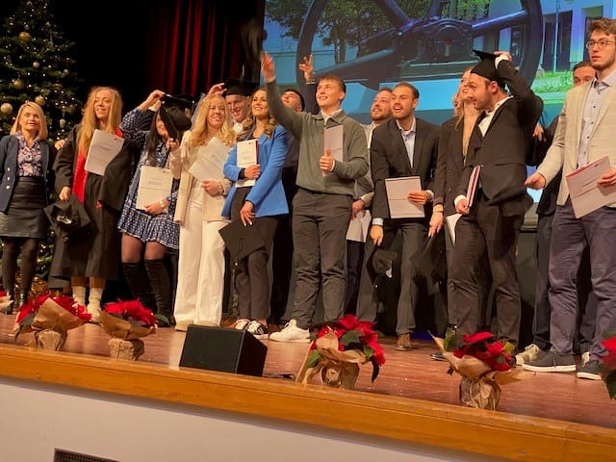 Am 01.12. war es wieder einmal in Präsenz so weit. Der Jahrgang 2019 wurde mit der Übergabe der Bachelorurkunden verabschiedet. Erstmals erhielten alle Absolventen einen eigenen Absolventenhut und es fand das traditionelle Werfen nach der Zeugnisübergabe gemeinsam statt (siehe Bild).