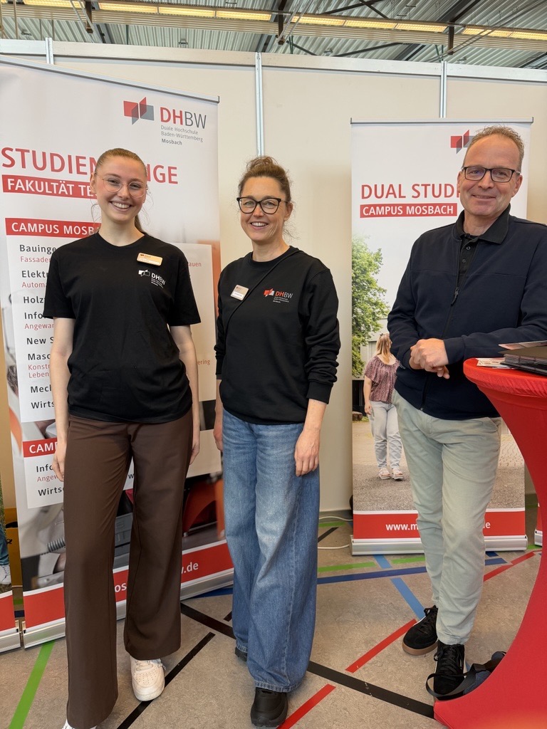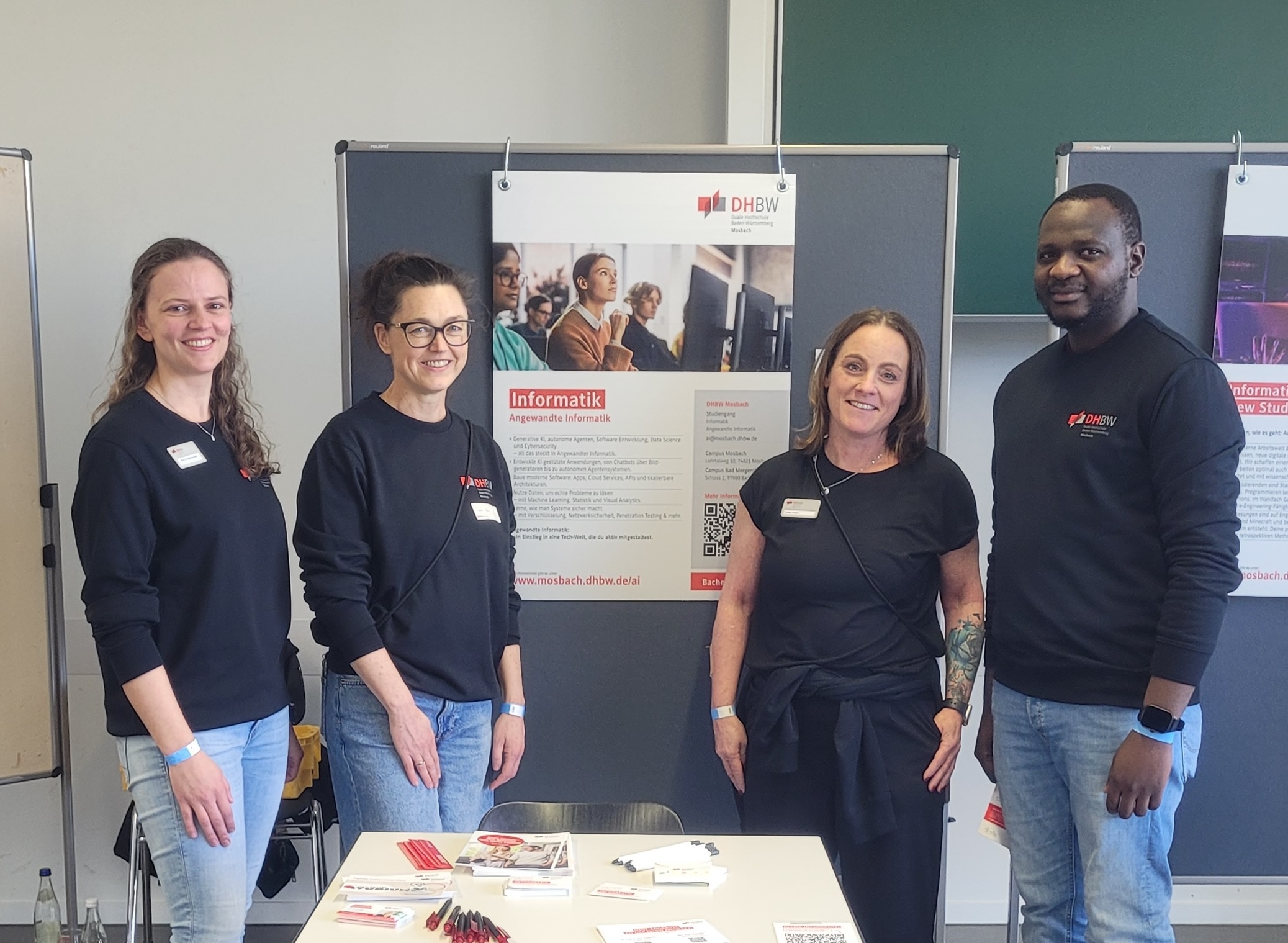 Mit dem Frühling starten auch die Jobmessen! Der Studiengang Angewandte Informatik der DHBW Mosbach und Campus Bad Mergentheim war auf mehreren regionalen Ausbildungsmessen vertreten. Sowohl auf der Ausbildungsmesse VS & Weinig am 28. Februar als auch beim Tag des Dualen Studiums in Mosbach am 7. März. Auch auf der Bildungsmesse in Lauda-Königshofen am 13. und 14. März konnten wir zahlreiche interessierte Besucherinnen und Besucher kennen lernen. Die vielen Gespräche, neugierigen Fragen und positiven Rückmeldungen haben uns gezeigt, wie groß das Interesse an einem dualen Studium in der Informatik weiterhin ist – und wie motivierend der direkte Austausch sein kann.