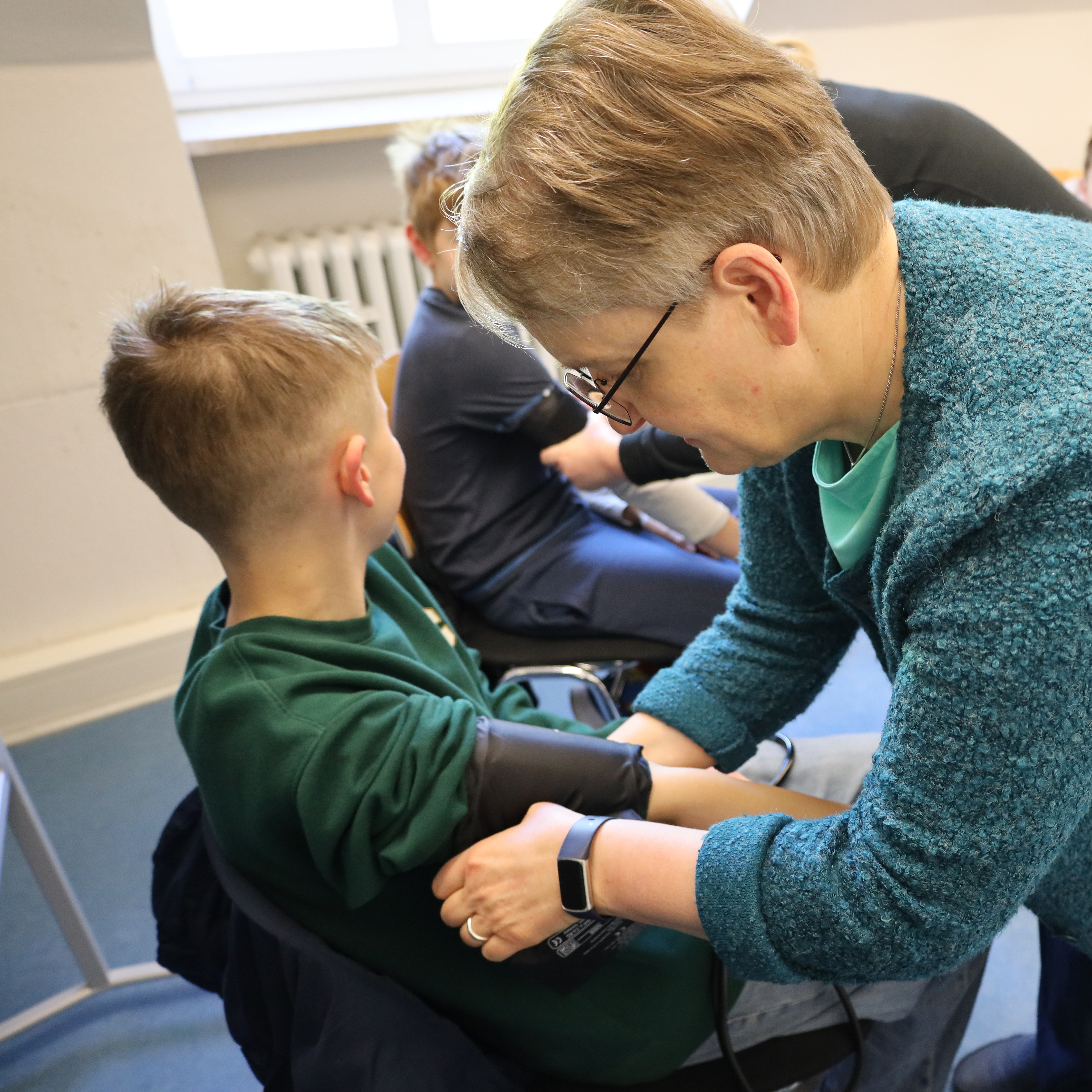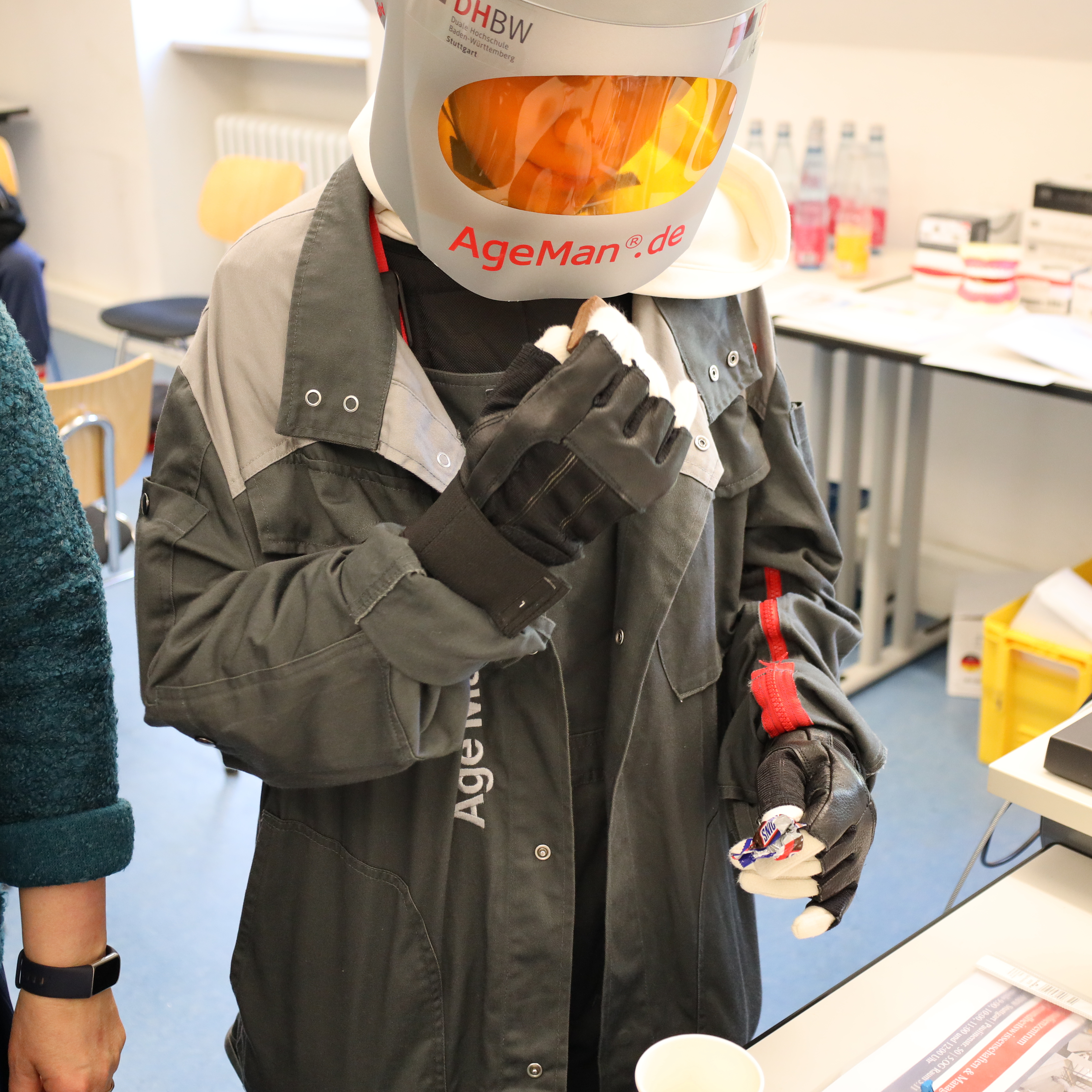 Während die Mädchen Technik erkundeten, schnupperten vier Jungen parallel dazu in den neuen Studiengang Pflege hinein. Mit einem Altersanzug erlebten sie am eigenen Körper, welche Einschränkungen das Älterwerden mit sich bringt: Getränkeflaschen öffnen, Schuhe binden oder Treppen steigen – alltägliche Aufgaben, die plötzlich zur echten Herausforderung wurden. Anschließend lernten sie, wie pflegebedürftige Menschen im Alltag unterstützt werden können. Blutdruck messen und Verbände wechseln standen ebenso auf dem Programm.
