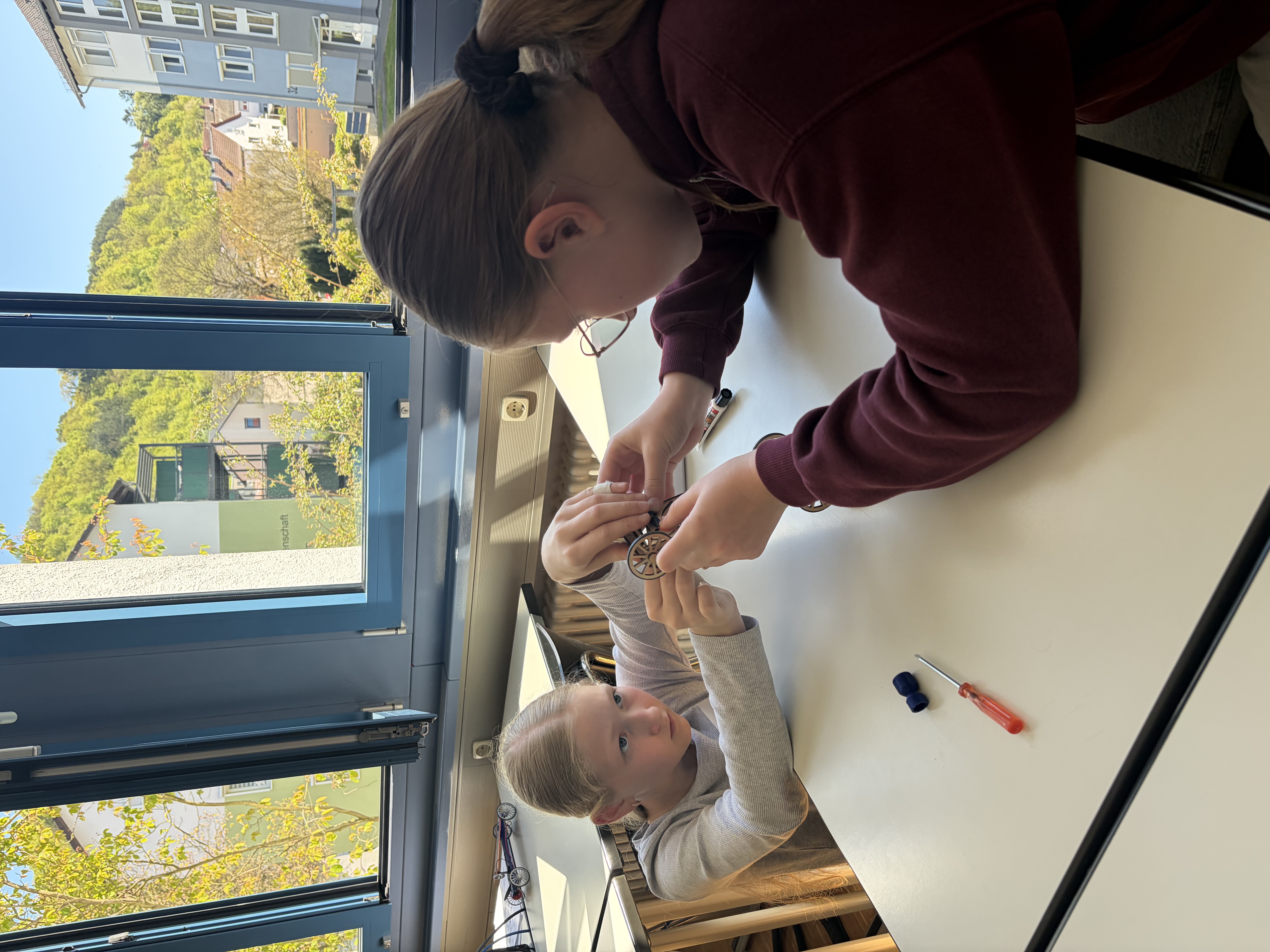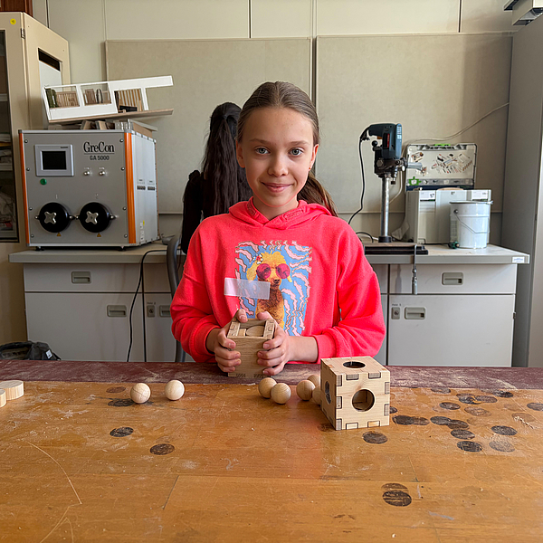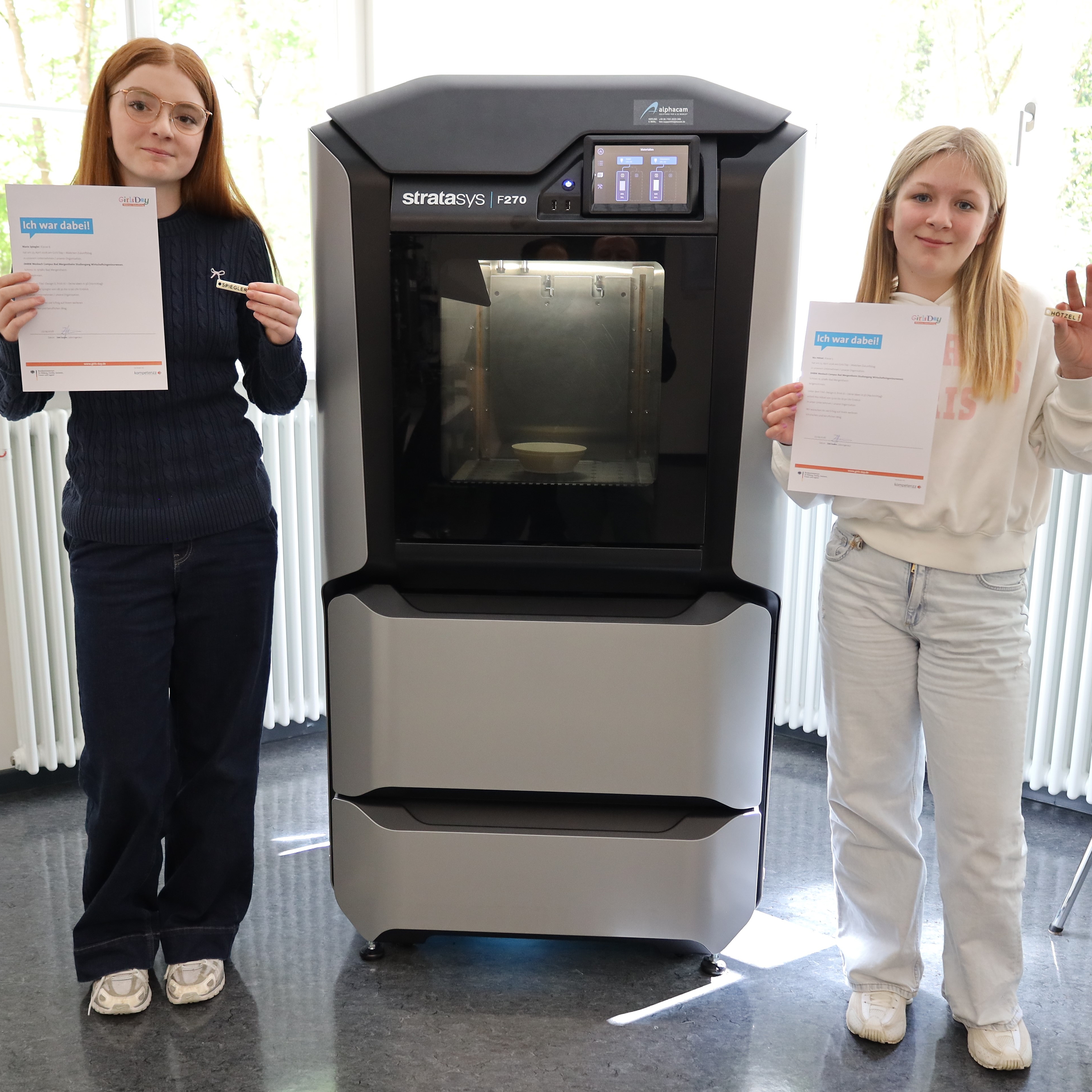 Nia Hötzel und Marie Spiegler wagten den Ausflug in die Welt des 3D-Drucks. Sie zeichneten zeichneten ihr erstes 3D-Modell – einen Schlüsselanhänger in einem CAD-Programm am Computer. „Besonders das Zeichnen hat uns Spaß gemacht", berichteten die beiden. Sie gestalteten ihr eigenes Namensschild als Schlüsselanhänger und beobachteten anschließend, wie der Drucker es aus vielen Schichten aufbaute. Am Ende konnten sie es stolz mit nach Hause nehmen.