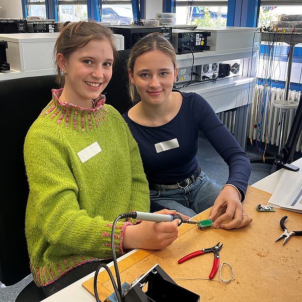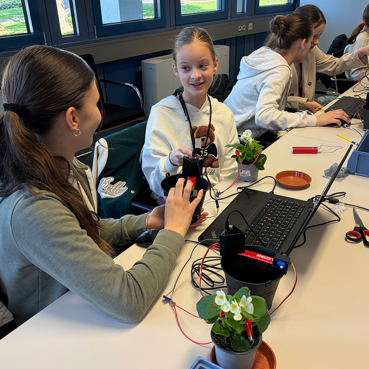 Ein besonderer Hingucker war der Workshop zur automatischen Pflanzenbewässerung. Geleitet wurde er von zwei Mechatronik-Studentinnen im sechsten Semester, die als „MINTfluencerinnen" jungen Mädchen als Vorbilder dienen möchten. Eine der beiden hatte während ihrer eigenen Schulzeit Jahr für Jahr am Girls' Day teilgenommen – und studiert heute genau das, wofür die Aktionstage einst ihre Begeisterung geweckt hatten. Die Teilnehmerinnen durften am Ende einen ganz besonderen Blumentopf mit nach Hause nehmen: Er übernimmt nicht nur die Bewässerung automatisch, sondern spielt auf Wunsch auch Schere-Stein-Papier oder kleine Melodien ab.