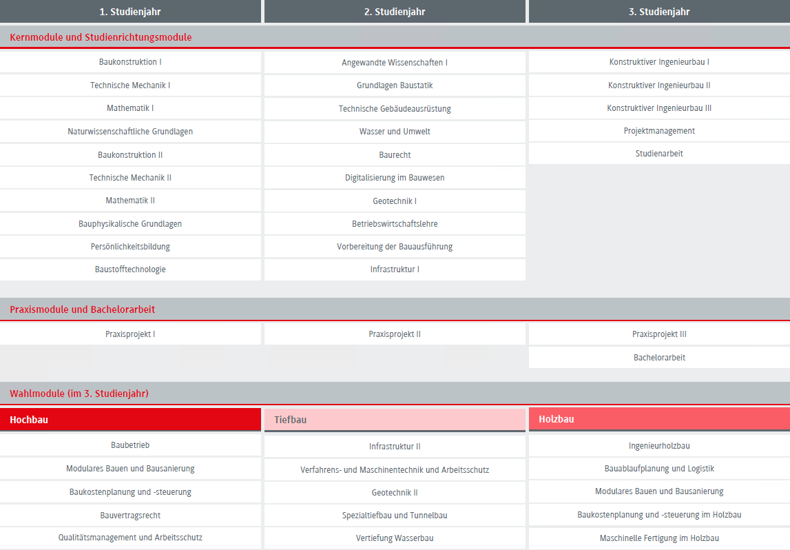 Die Kernmodule und Studienrichtungsmodule sind für die drei Schwerpunkte Hochbau, Tiefbau und Holzbau gleich. Ab dem 5. Semester unterscheiden sich die Inhalte durch Wahlmodule.